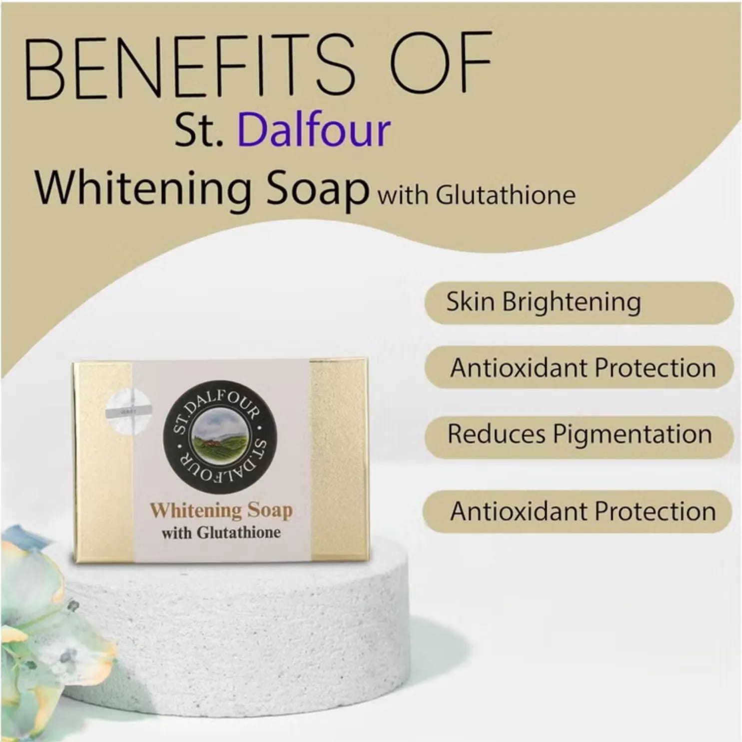 ST. DALFOUR Whitening Soap with Glutathione brightens and evens skin tone, lightening dark spots and reducing unevenness. Enriched with antioxidants, it protects against aging while hydrating and nourishing skin.
